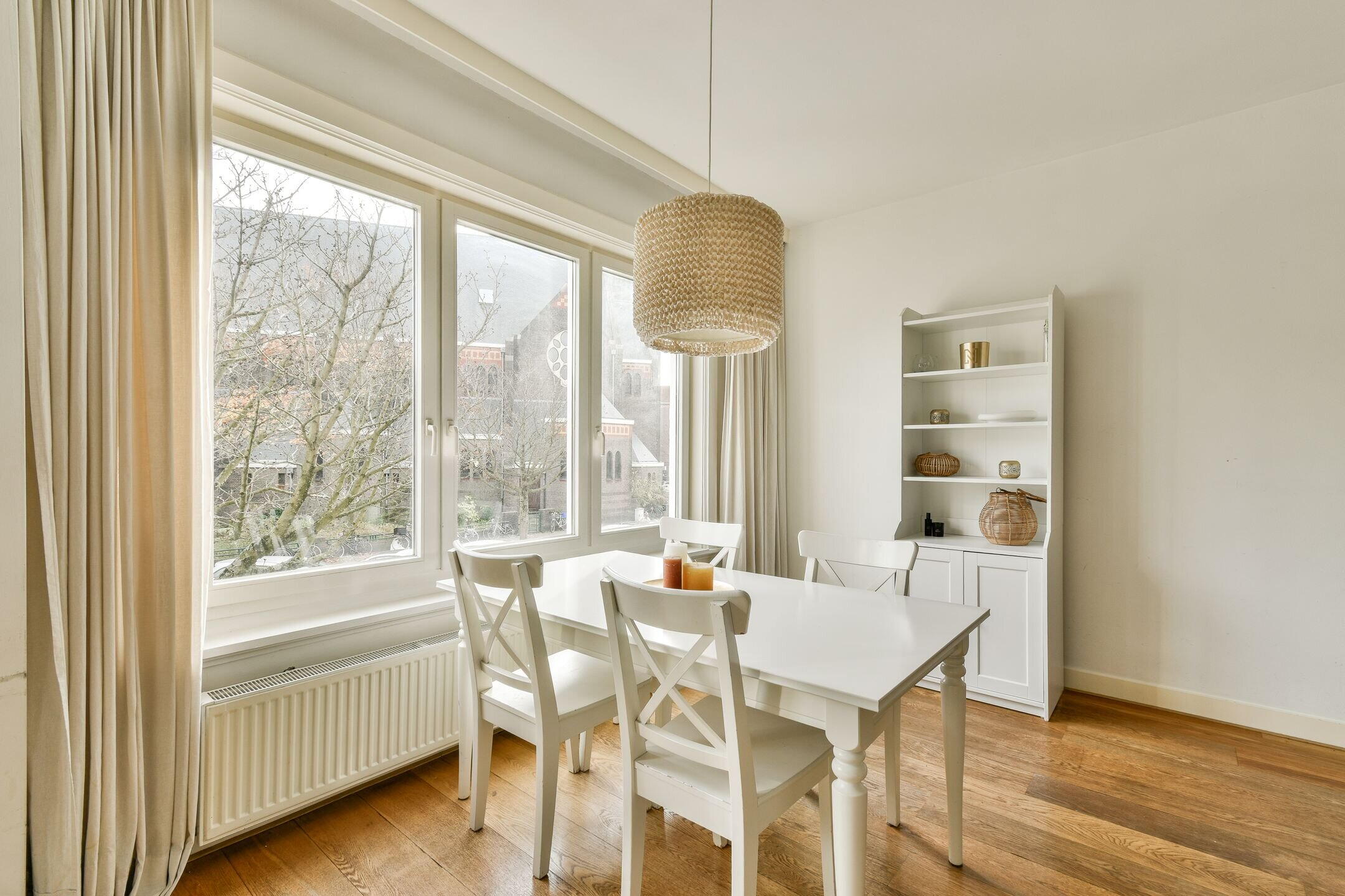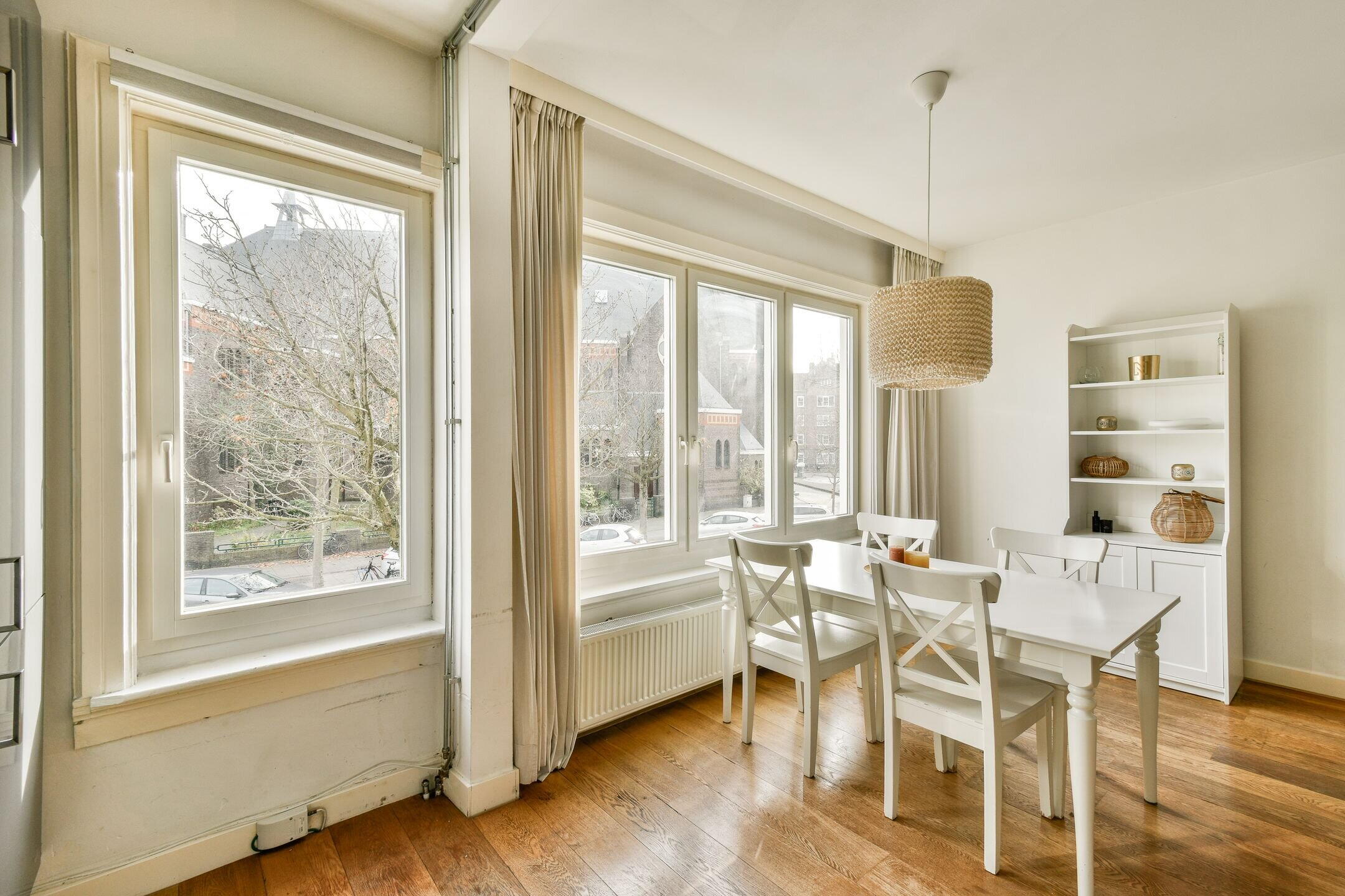 Hele lichte woning gelegen op de eerste verdieping met prachtige uitzicht op de Vredeskerk in de populaire Pijp en balkon op het westen.