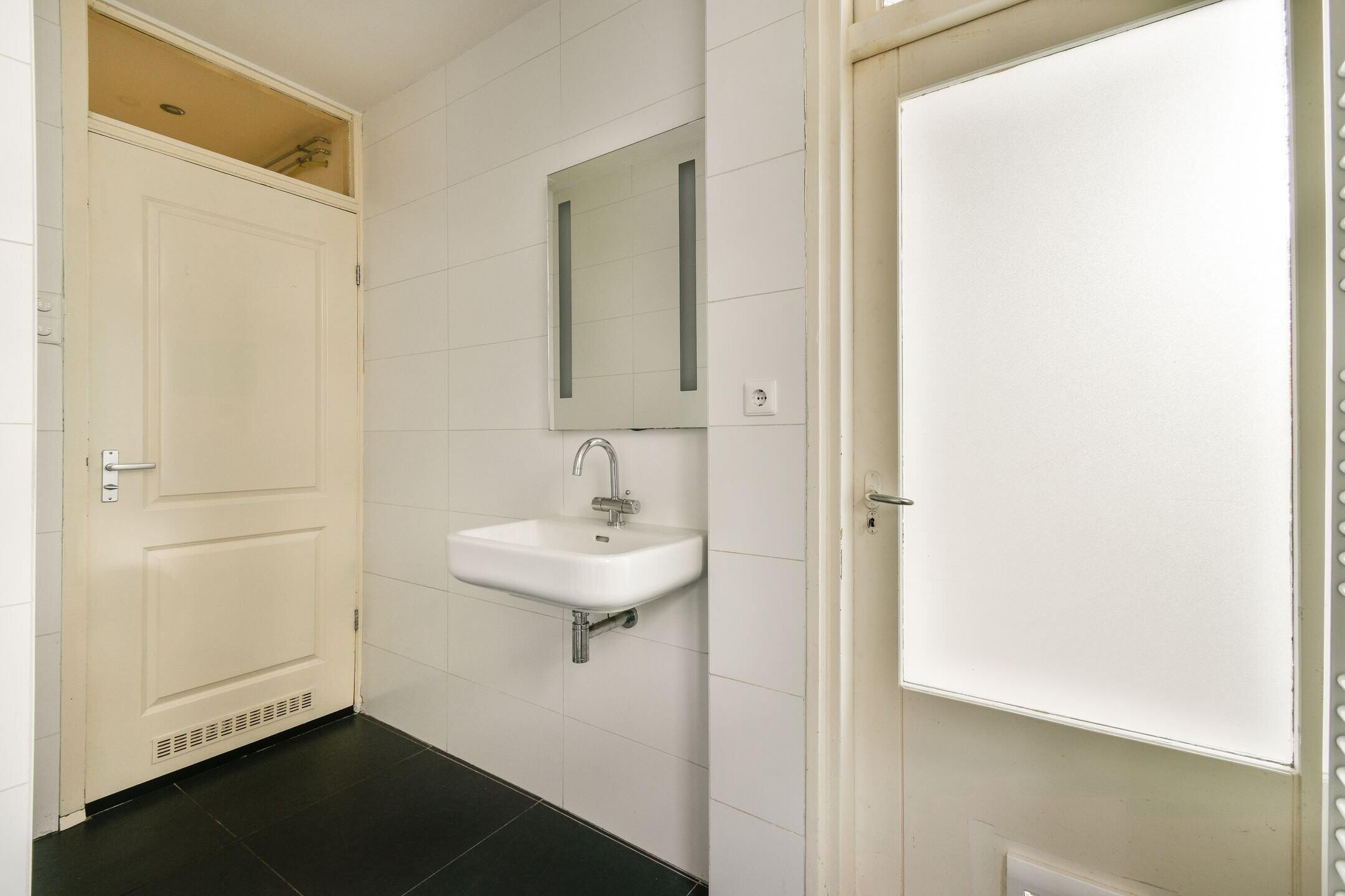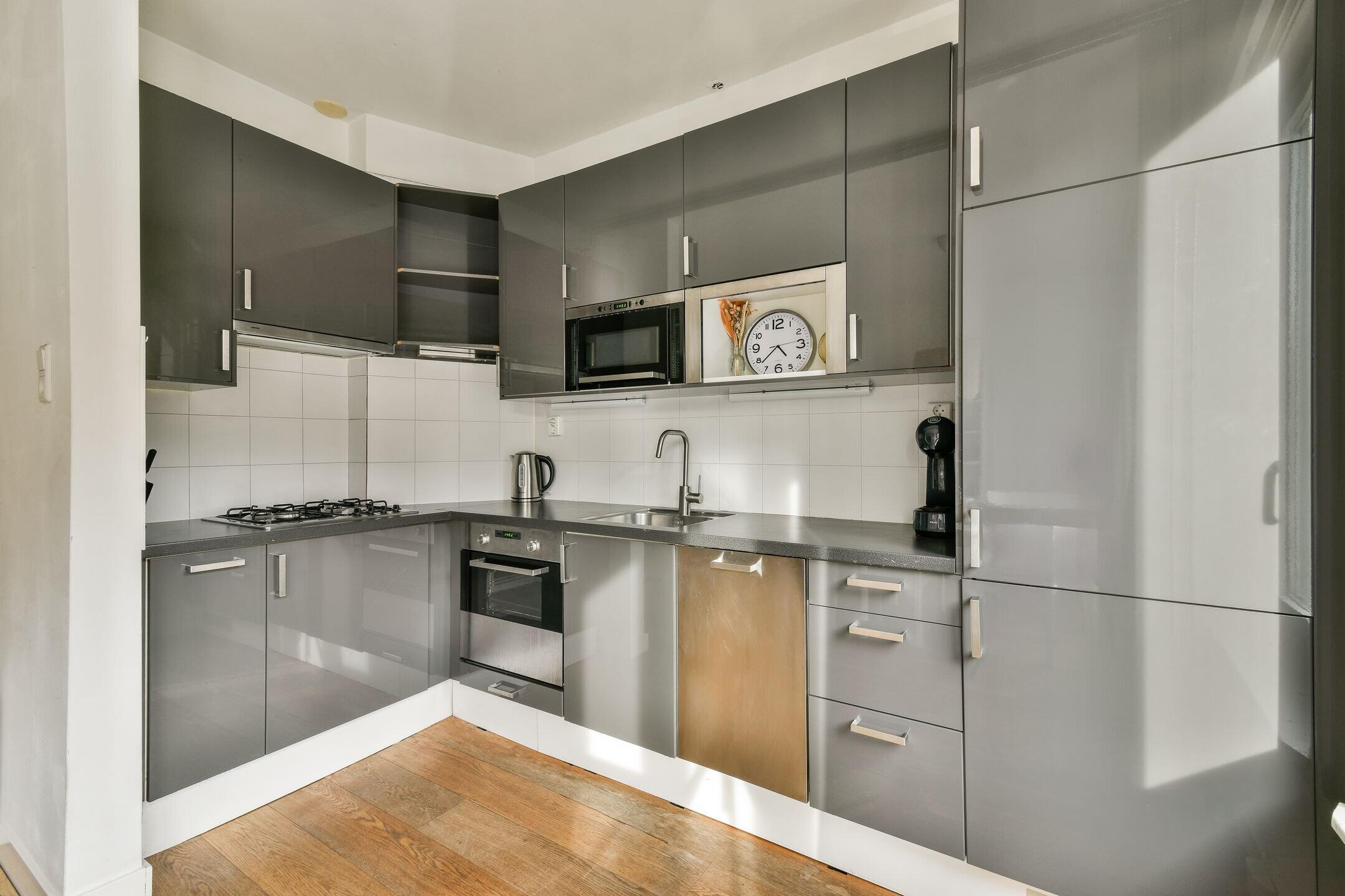 Shared entrance with a well-maintained and wide staircase leading to the first floor, meter cupboard in the communal stairwell, hallway, bright living room, and open modern kitchen equipped with a dishwasher, oven, microwave, fridge-freezer, gas stove with built-in extractor, and ample cupboard space. The bedroom has access to the west-facing balcony. The spacious bathroom features a shower, washbasin, and space for a washing machine and dryer. The Intergas central heating system (2019) is also located here. There is a separate toilet with a washbasin. The apartment has a neat wooden floor and double-glazed plastic window frames at the front.
